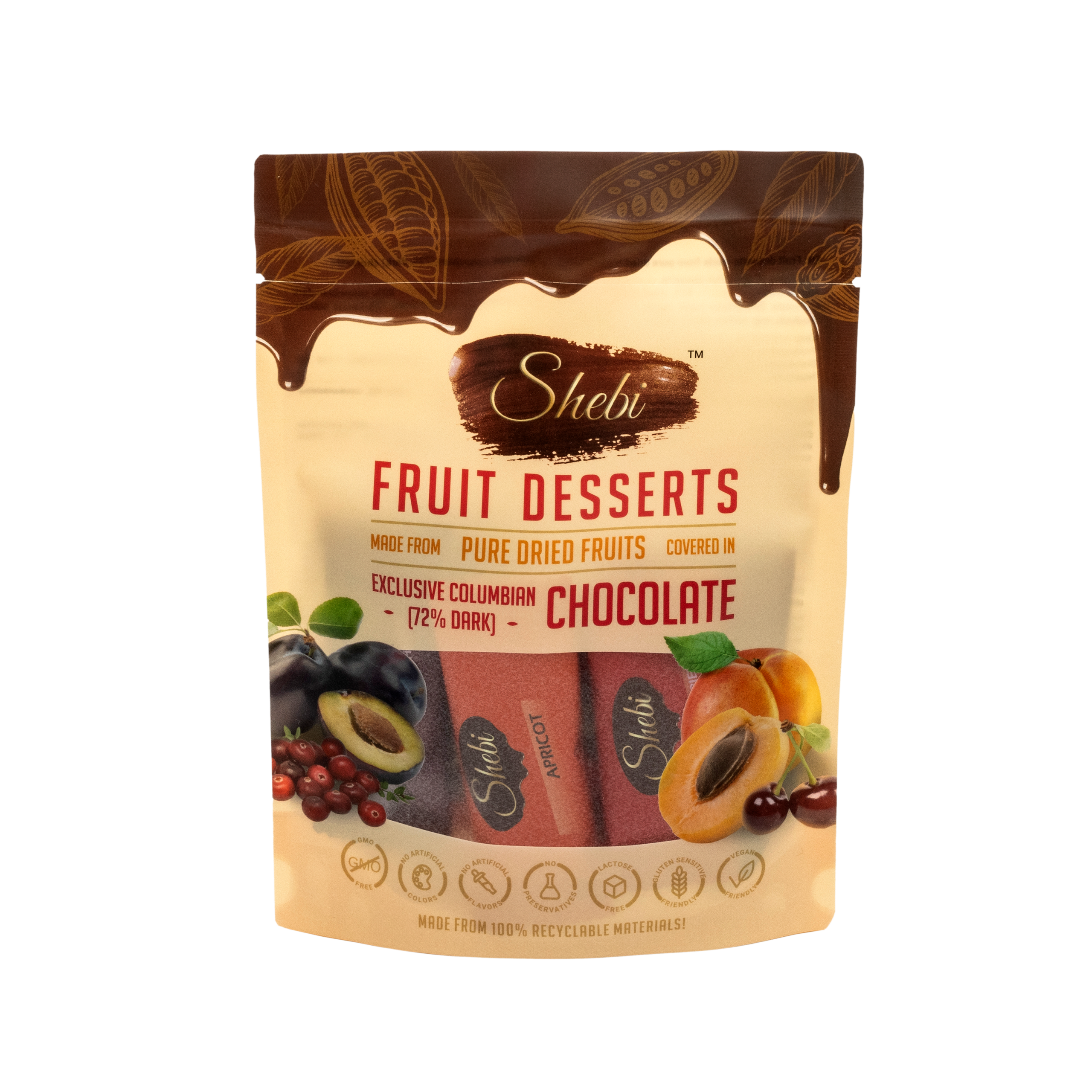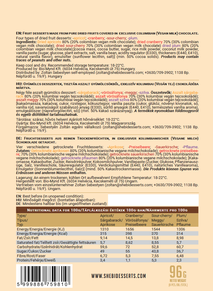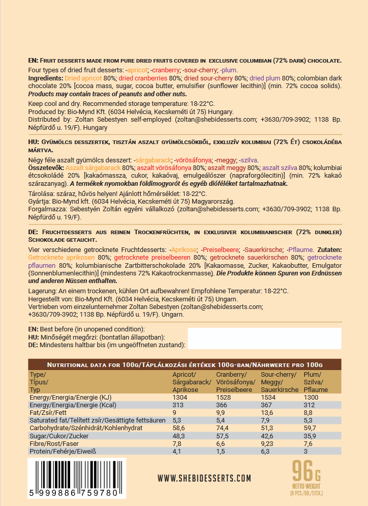A Shebi márkájú gyümölcs desszertek a legkiválóbb alapanyagokból készülnek, ezért adják a legintenzívebb csokis-gyümölcsös íz élményt, amit valaha kóstoltak, és mindezt ízfokozók és egyéb nem természetes összetevők Nélkül!